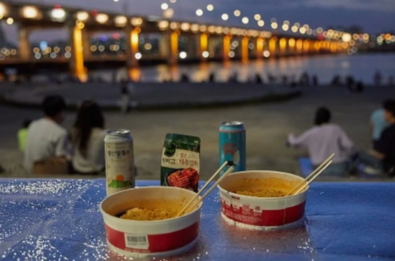 Корейцы говорят: если вы не ели рамен у реки, вы не были на корейском пикнике. В магазинчиках у парков можно купить какую угодно лапшу рамен, там же полно автоматов по приготовлению рамена. Машина сама наливает нужное количество воды и поддерживает нужную для заваривания лапши температуру ровно 3 минуты. Есть горячую, острую лапшу, когда с реки дует прохладный вечерний бриз — это обязательный пункт программы корейского пикника.