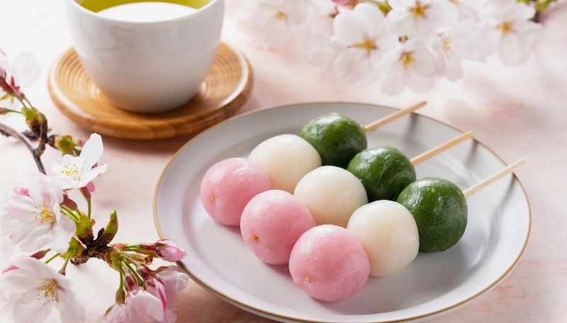 Пикник – время лакомиться сезонными разновидностями традиционных японских десертов вагаси. Например, три легендарных шарика из рисового теста на шпажке – розовый, белый и зеленый (всемирно известное лакомство «Ханами Данго»). Розовый цвет символизирует бутоны сакуры, белый — последний снег уходящей зимы и цветение белой сливы, а зеленый — молодую весеннюю траву и приближение лета. Иногда эти сладости называют «Трехцветными шариками» («Сансёку Данго»), но весной в парке их именуют только «Шариками для любования цветущей сакурой» («Ханами Данго»).