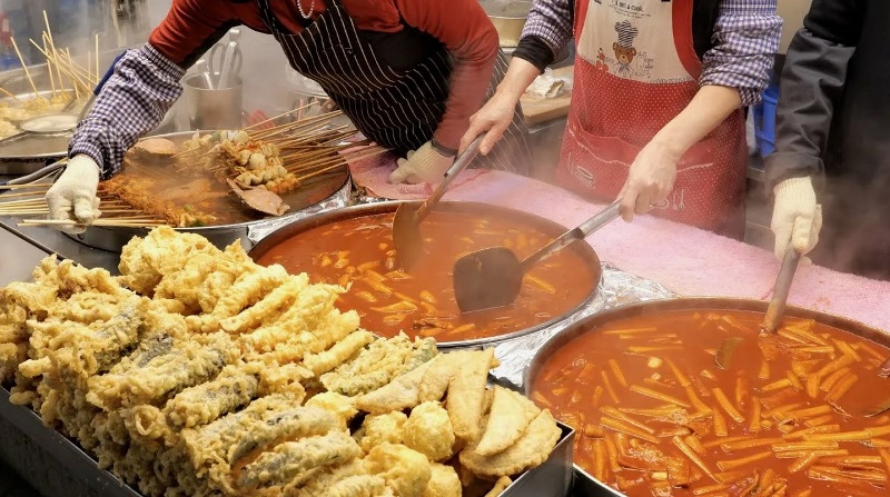Острые рисовые палочки Токпокки покупаются уже готовыми и горячими. К ним «в комплект» обязательно идет наваристый бульон с пластинками из рыбного фарша Омук на длинных деревянных шпажках. Бульон отлично согревает, когда солнце заходит и становится прохладно.
