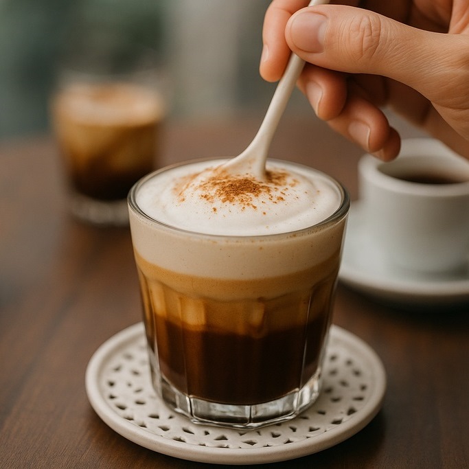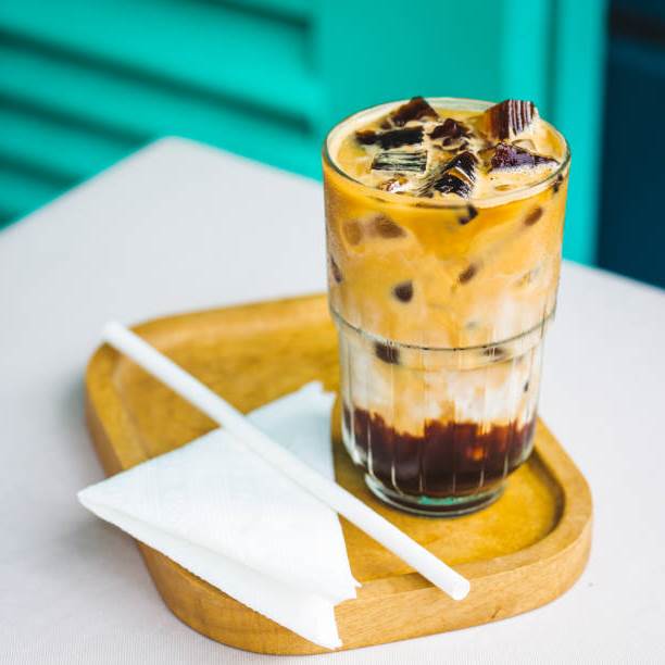 Этот напиток подают и холодным – в этом случае в кофе сначала добавляют кубики льда, а затем кокосово-молочную смесь.