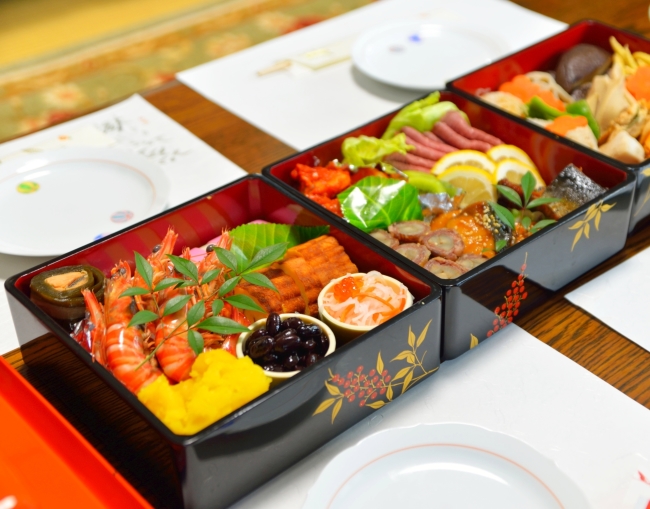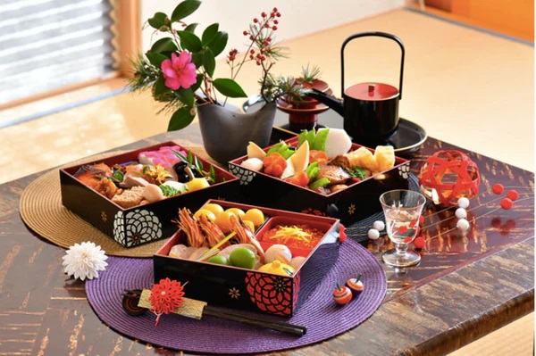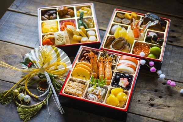 В качестве новогодних блюд, которыми заполняются изящные шкатулки, выступают закуски из соевых бобов («крепкое здоровье»), морских водорослей («радость и счастье»), овощей, особенно корня лотоса и корня лопуха, а также яичные рулеты тамагояки («мудрость и сила знаний») и блюда из рыбы («процветание и успех»). Кроме этого, в качестве новогодних закусок приветствуются креветки, рулетики из бекона и ветчины, икра морских рыб, сашими и традиционные японские суши. Чтобы продумать состав новогодних шкатулок с угощениями и приготовить их, у японских семей уходит несколько дней кропотливого труда. Многие рестораны в Стране Восходящего Солнца закрываются на период с 1 по 3 января, и поэтому подготовка домашней еды для празднования Нового года имеет важнейшее значение.