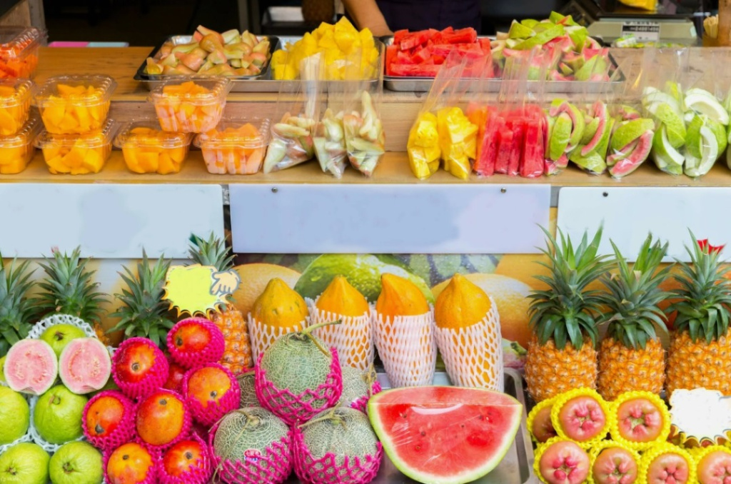 Благодаря тропическому климату остров богат фруктами. Тайвань считается родиной 45 видов экзотических плодов. Фрукты занимают особое место в местной культуре питания — ни один семейный ужин не обходится без большого блюда с нарезанными плодами. Хозяин обязательно заметит, что это полезно для желудка. Особенно популярны тропические фрукты (такие, как «глаз дракона» (лонган), личи, папайя, ананас, манго, гуава, бананы, маракуйя, кокосы), цитрусовые, персики, яблоки, дыни, местные виды груш и слив. Пара любопытных деталей: фрукты здесь едят не руками и не палочками, а бамбуковыми зубочистками, а кроме того, тайваньцы предпочитают многие фрукты в недозрелом виде. Интересно, что миниатюрные помидоры «черри» (от англ. cherry — «вишня») на Тайване тоже считаются фруктами. А вот классические помидоры к столу подают в качестве овощей в недозрелом виде, зелёными.