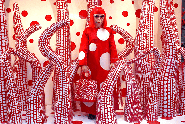 Яёй Кусама прославилась не только искусством, но и провокационным поведением. Ей не составляло труда обнажиться на публике, ее любимым приемом перформанса были оргии, а однажды она написала президенту США Ричарду Никсону письмо, в котором утверждала: «нельзя искоренить насилие, применяя еще большее насилие.
