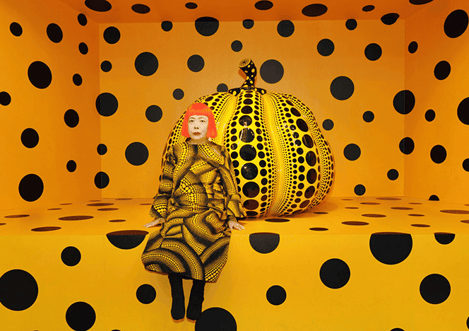 Одна из самых известных и влиятельных художниц Японии и самая успешная и продаваемая из ныне живущих представителей современного искусства. Ее главные стили — это поп-арт и арт-брют, а работы основаны на идее паттернов и повторов. Большая часть ее работ основана на повторяющемся узоре в горошек, за что ее прозвали «Королевой горошка».