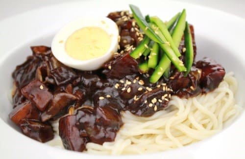 - Чачжанмен — удон со свининой и густым соусом на основе пасты из черных бобов чхунджан. Это одно из самых узнаваемых блюд корейско-китайской кухни.