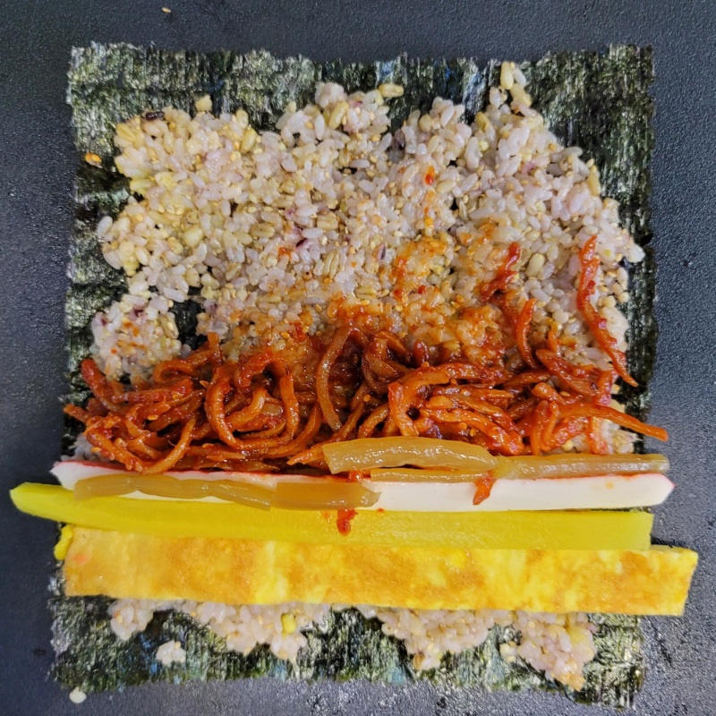 Рис для футомаки готовится так же, как и рис для суши – приправляется рисовым уксусом с добавлением небольшого количества сахара и соли. А для риса, применяемого для приготовления корейского кимбапа, уксус никогда не используется. Вместо этого в вареный рис иногда добавляют нерафинированное кунжутное масло, которое дарит блюду тонкий ореховый аромат и уникальные вкусовые оттенки, весьма украшающие рис. А еще корейцы с удовольствием готовят кимбап не только из белого, но и из коричневого и из черного риса, ведь такой рис более полезный. Готовый рис перед использованием немного подсаливают.