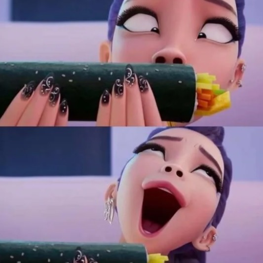 Лакомиться неразрезанным традиционным роллом кимбап стало модным трендом совсем недавно, в 2025 году, во многих странах мира, где любят и уважают корейскую кухню. Такой способ угощения кимбапом стал мегапопулярным после выхода американского мультфильма «Кей-поп-охотницы на демонов», в котором есть сцена, где Руми, главная героиня мультфильма, буквально заглатывает целиком неразрезанный ролл-кимбап (в одной из наших статей мы рассказывали об этом мультфильме и выкладывали гифку с этим забавным эпизодом). Эта символичная сцена, с юмором демонстрирующая сверхспособности Руми, превратилась в настолько яркий и вирусный мем, что стала известна всему мировому сообществу ценителей корейской культуры, даже среди тех, кто не смотрел мультфильм. Это, в свою очередь, породило популярность челленджей, имитирующих поедание кимбапа за один присест.