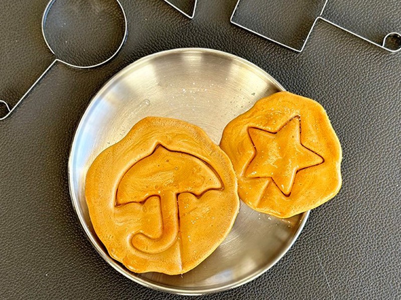 Фигурной вырубкой надавить в середину лепешки, но не сильно. Тогда получится оттиск.